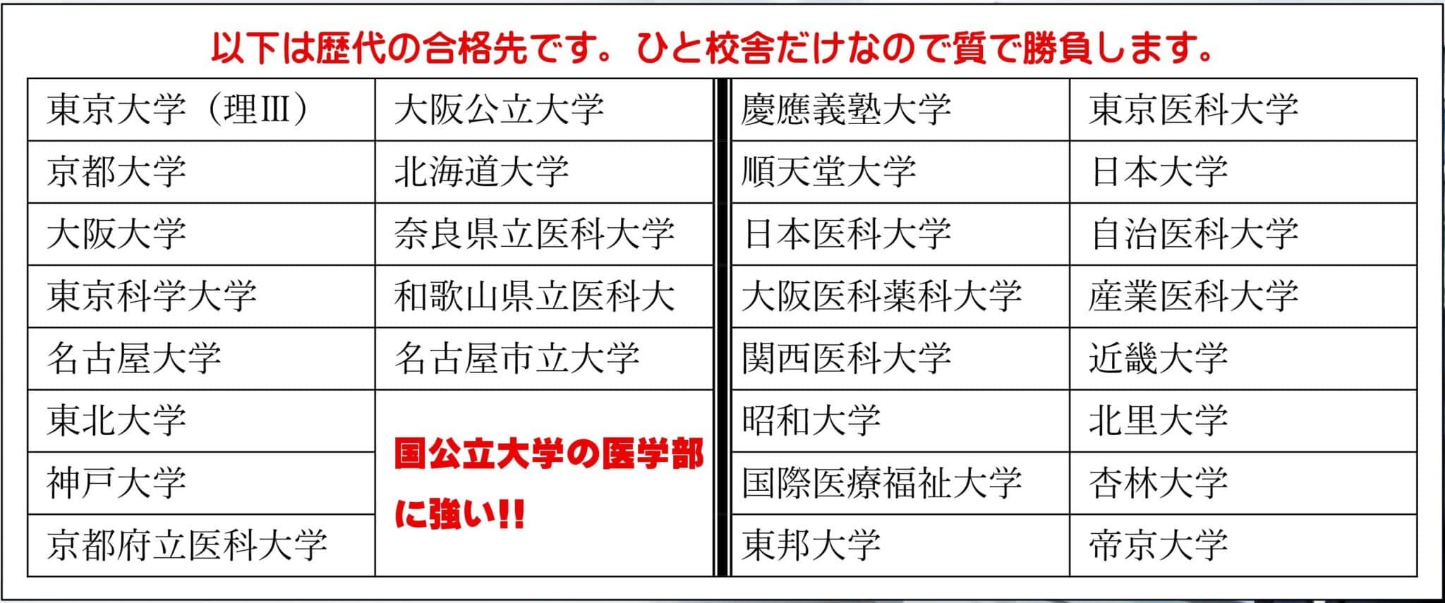 ⑥ 国公立大学医学部医学科の入試に非常に強いシステムで応援します。最初は私立大学医学部のみを目指していても,十分な成績を上げて,国語と社会の勉強を追加して,国公立大学医学部に進学できた生徒も過去にたくさんいます。
