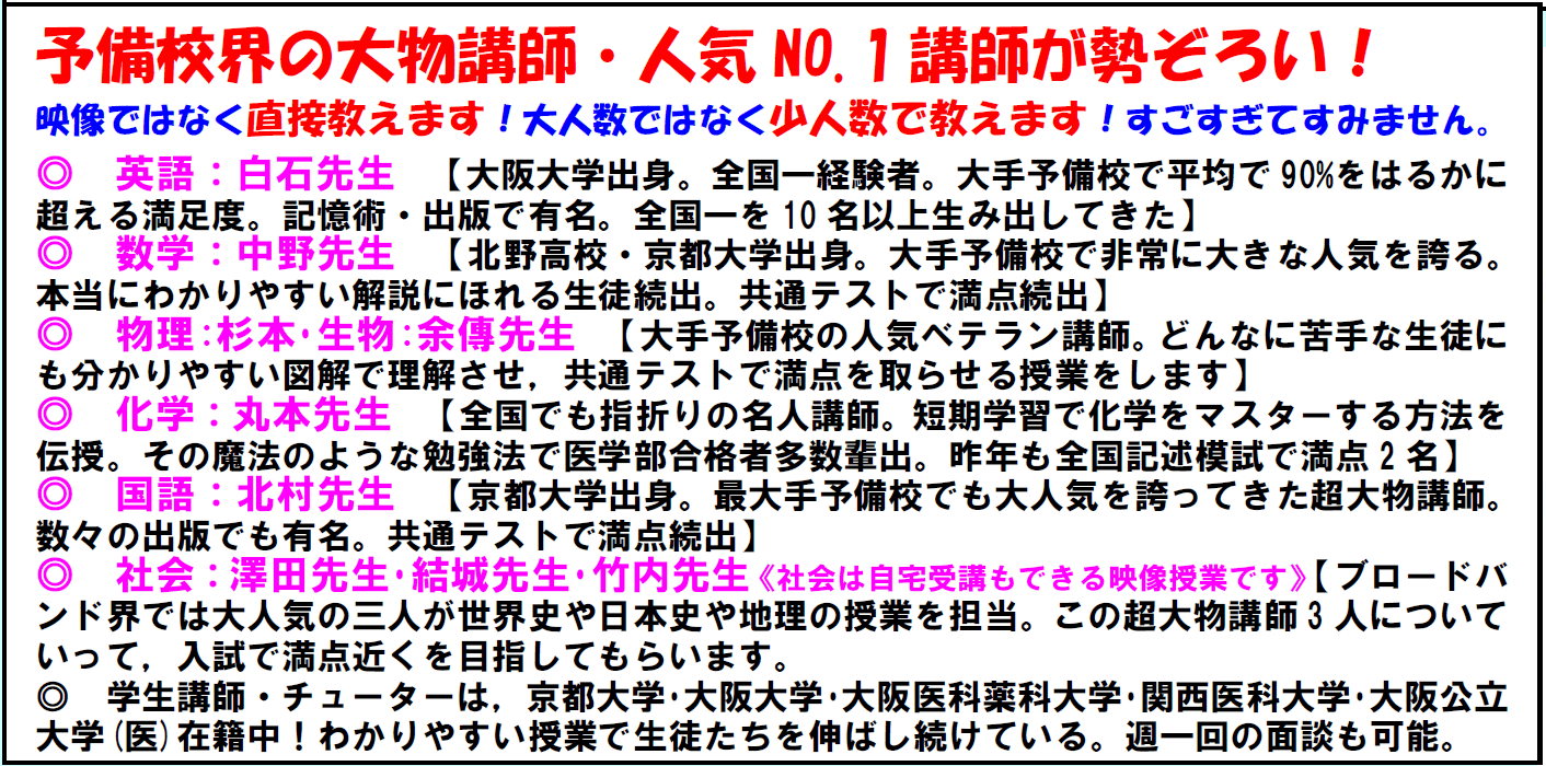 ※ 「在宅でも受講可能な大学受験予備校」全国・海外での在宅授業が受けれるようになりました。遠方の方はご相談ください。