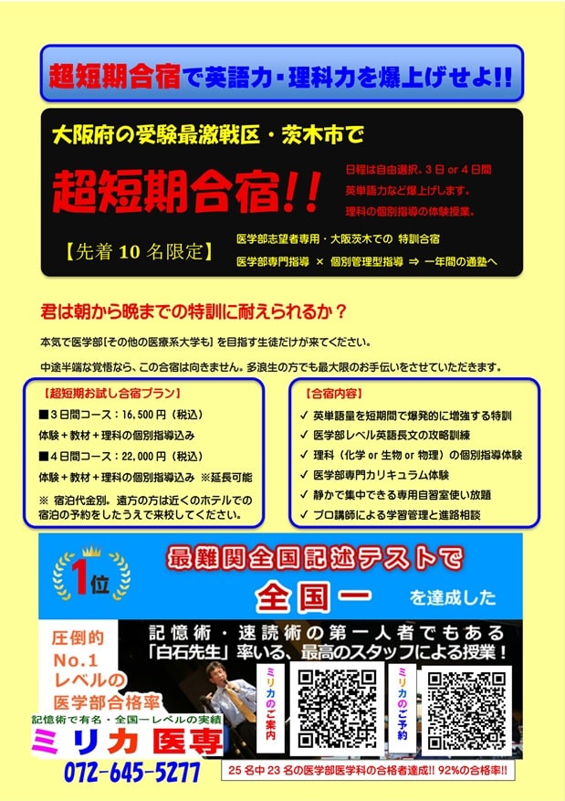 ミリカ医専は大阪府茨木市にあります。他の色々な予備校に通った後、ミリカを選んでくれて、京都府・兵庫県・奈良県・滋賀県・和歌山県からも通っている生徒たちもいます。非常にたくさんの人が推薦してくれている医学部受験専門予備校です。安価で家計に優しい授業料でエリート教育をみなさんに提供しております。基本的に同業の個別指導付きの医学部専門予備校の2分の1~3分の1の授業料で通っていただけます。高い授業料を払って何年も浪人した方たちが金銭的に疲弊するという問題もミリカでは起こりません。医学部受験に行き詰まれば、とにかく大阪府茨木市の医学部受験専門予備校のミリカに来てください。個別指導・チューター面談・いつでもできる質問・月に一度の保護者様への月次報告・定期的な三者懇談・定期的な外部模試と塾内模試などがミリカの特長になっています。特に、記憶術の習得と速読術の習得はミリカ予備校・ミリカ医専でしか体験できません。個別指導で伸ばし,集団授業で競争し,映像授業ではなく,リアルの対面授業で伸ばすNo.1レベルの実績の予備校です。一人一人を大事にし、管理を徹底します。どこの医学部受験専門の予備校や大手予備校よりも確実に短期で伸ばします。